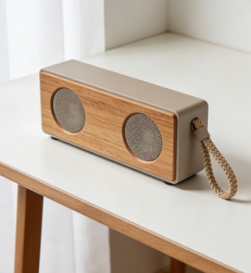 长方体造型,木质前板与哑光机身结合,侧面带有编织手提带。